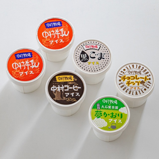 各フレーバーを2個または1個ずつセットに。多彩な味を楽しみたい方にもどうぞ。 ■中村牛乳アイス 卵を使わず、さっぱりと仕上げました。牛乳そのものの美味しさをご堪能ください ■中村コーヒーアイス 世代を問わず愛飲されている「中村コーヒー」が、そのままアイスに!コーヒーの苦みは控えめ。どこか懐かしい味わいです。 ■都城茶 夢かおりアイス 地元・都城の大石製茶園「ゆめかおり」を使った日本茶アイス。お茶の苦みはほんのりで、抹茶が苦手な方にも好評です。 ■バニラアイス 県産の卵を使用し、コク豊かに仕上げました。シンプルだからこそ後引く美味しさです。 ■ココアアイス ほろ苦く、甘い香りのカカオをほど良く利かせた大人の味わい。甘いものが苦手な方にもおすすめです。 ■チョコレートチップアイス チョコレートチップアイス=子どもから大人まで大好き!サクサクとしたチョコレートチップの食感が楽しい一品です。 ■黒ゴマアイス ふんだんに練りこまれた黒ゴマの香ばしさを濃厚なミルクのバランスが絶妙。リピーター多数の人気フレーバーです。 ------------------------------------------------------------ ◎Aセット 中村牛乳アイス×2個、中村コーヒーアイス×2個、都城茶夢かおりアイス×2個のセットです。 ◎Bセット 中村牛乳アイス×2個、都城茶夢かおりアイス×2個、黒ごまアイス×2個のセットです。 ◎Cセット 中村牛乳アイス×2個、バニラアイス×2個、チョコレートチップアイス×2個のセットです。 ◎Dセット 中村牛乳アイス×1個、中村コーヒーアイス×1個、都城茶夢かおりアイス×1個、ココアアイス×1個 、チョコレートチップアイス×1個、黒ごまアイス×1個のセットです。 ◎Eセット バニラアイス×1個、中村コーヒーアイス×1個、都城茶夢かおりアイス×1個、ココアアイス×1個、チョコレートチップアイス×1個、黒ごまアイス×1個